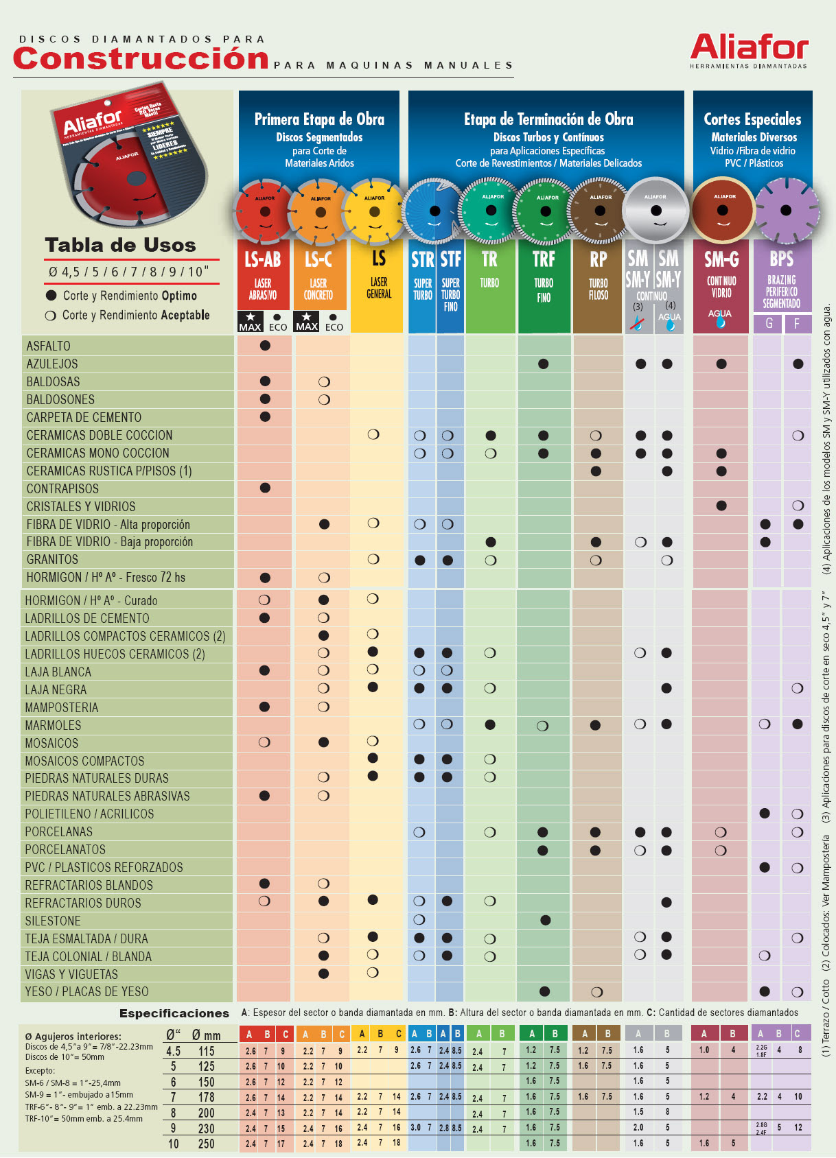 El desarrollo se orienta a una herramienta que combine rendimiento superlativo – cuando se cortan materiales de bajo costo – y con una calidad y precisión excelente – cuando se cortan materiales de alto costo-. Aliafor le garantiza rendimiento,seguridad y calidad con el menor costo final por metro cortado. Por lo cual desarrollamos discos diamantados acorde al Uso y a las Características de los materiales del Mercado Argentino.