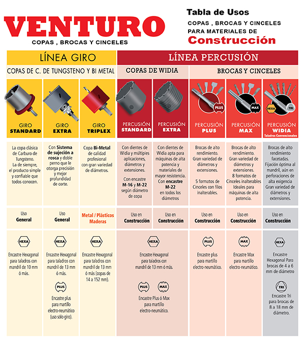 La calidad del inserto de carburo de tungsteno como el acero de las Brocas Plus – Max – Widia , han sido desarrollados para soportar importantes esfuerzos de torque y percusión propios del tipo de máquina en el que se utilizan . Ideales para realizar agujeros en mampostería, baldosas, baldosones, bloques de cemento, hormigón, granito.