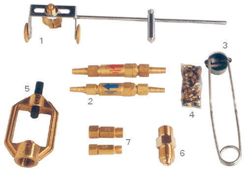 La línea de accesorios incluye: carro-guía y compás, cápsulas arrestallamas, chispero, piedra repuesto, grampa para reductor Acetileno, acoples Argón, antirretroceso a bolita.